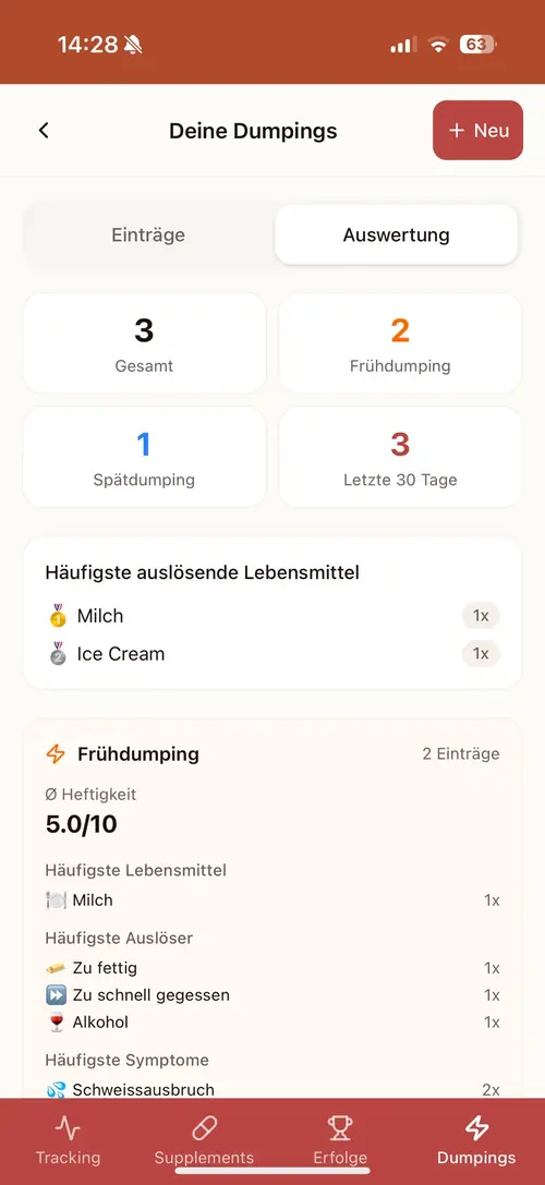 Erfasse deine Dumping-Episoden und entdecke Muster. Die intelligente Auswertung zeigt dir deine häufigsten Auslöser, Symptome und Lebensmittel – damit du Dumpings in Zukunft besser vermeiden kannst.